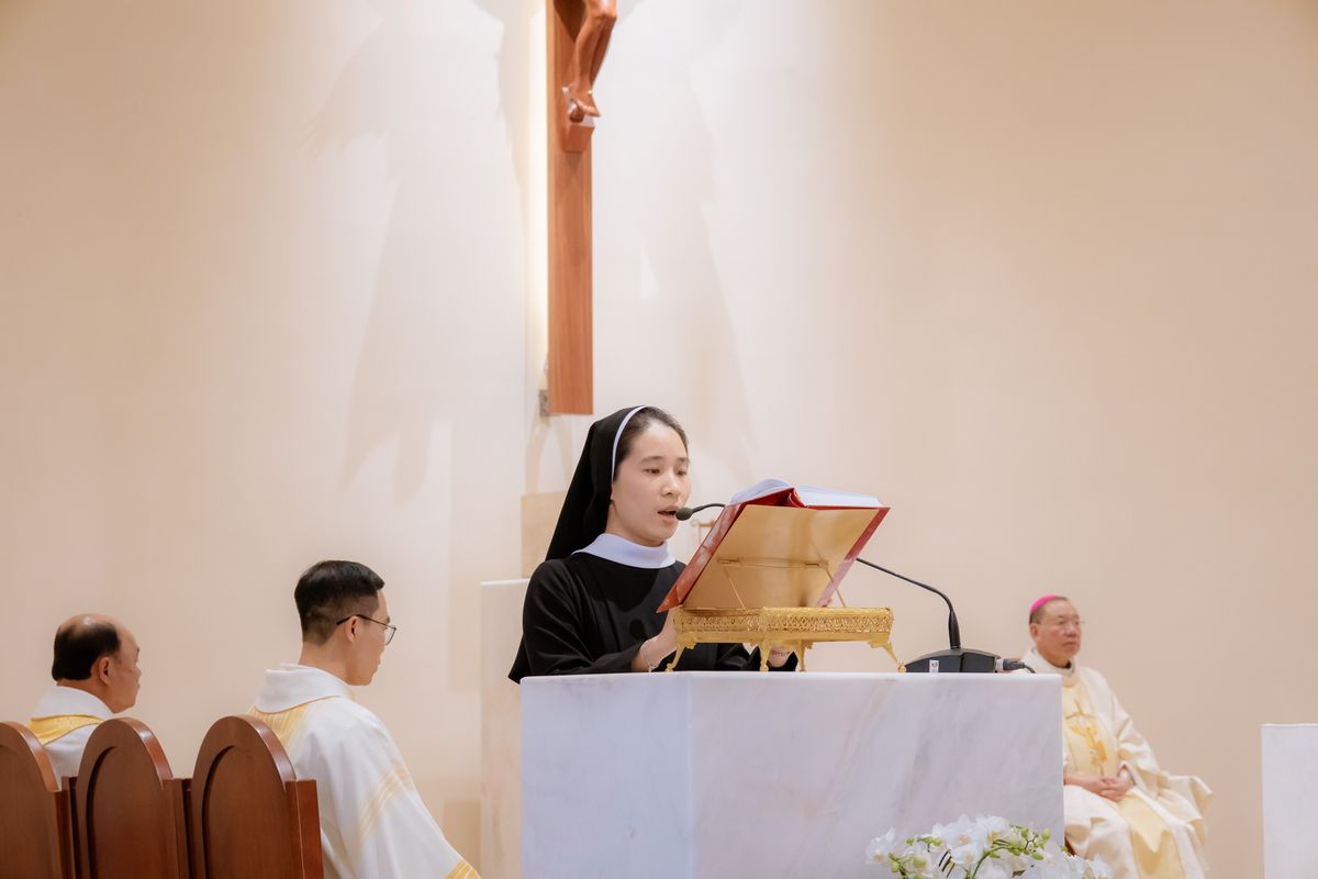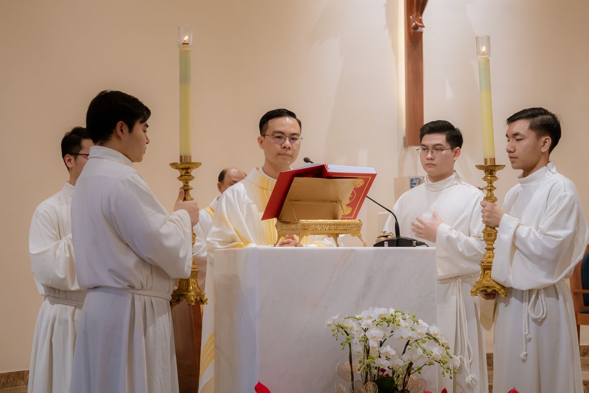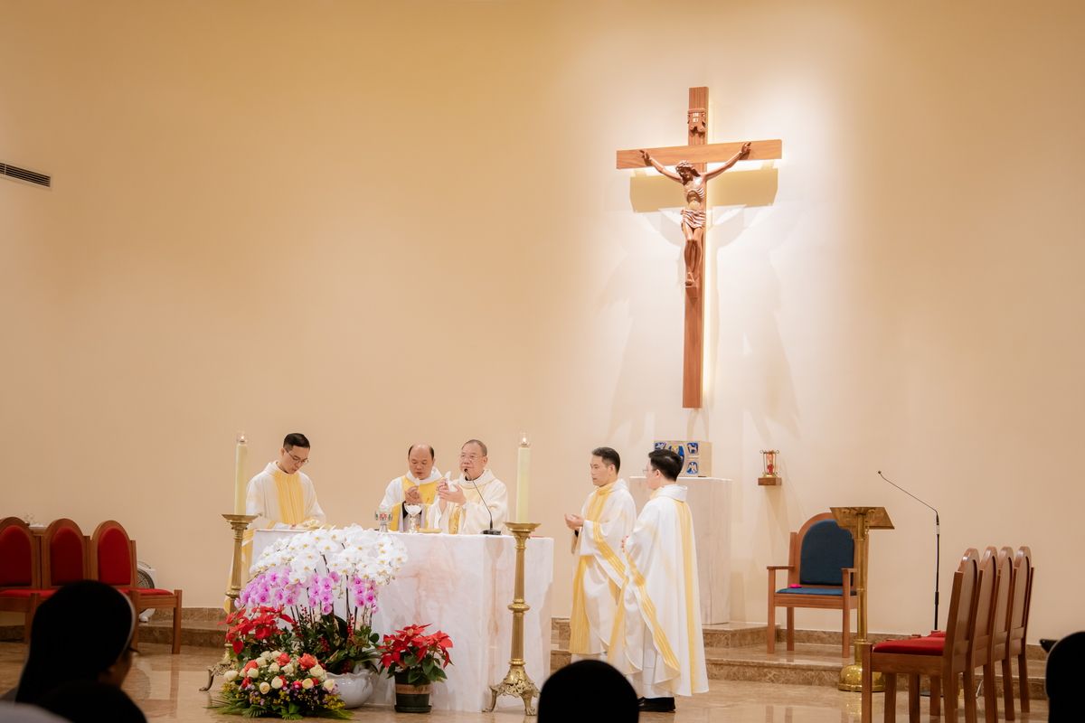 Thánh lễ tạ ơn do Đức Tổng Giám Mục (TGM) Giu-se Vũ Văn Thiên, Giám đốc Học viện chủ sự. Đồng tế với ngài có quý Cha trong Ban Điều hành, quý Cha giáo, quý Sơ, quý Giảng viên, cùng toàn thể quý Học viên.